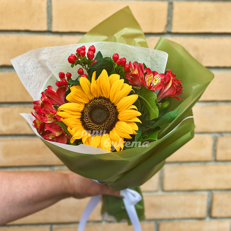 Букет из красных альстромерий с подсолнухом