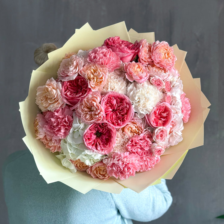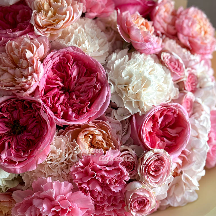 Букет розовых пионовидных и кустовых роз