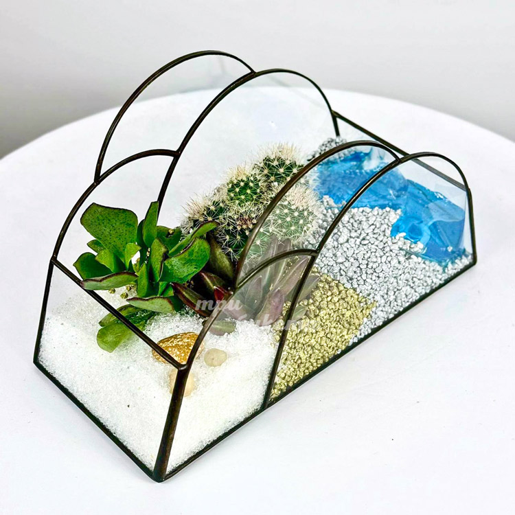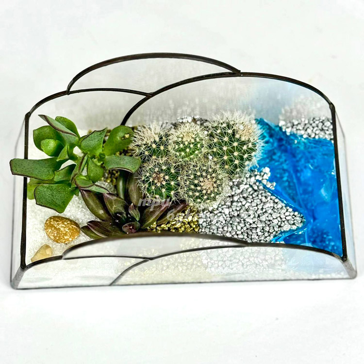 Флорариум с кактусом, суккулентами и водоемом
