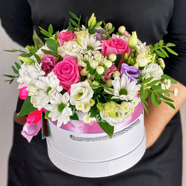 Коробочка с белым гиперикумом и хризантемами