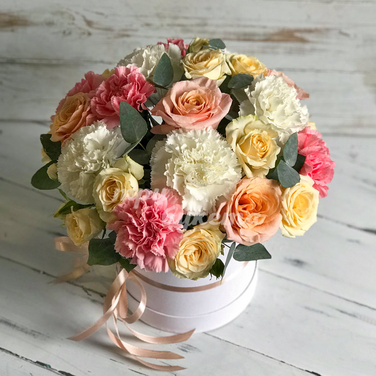 Нежные розы и гвоздики в коробке