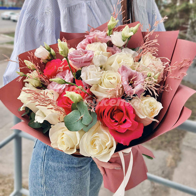 Пышный букет из роз и эустом